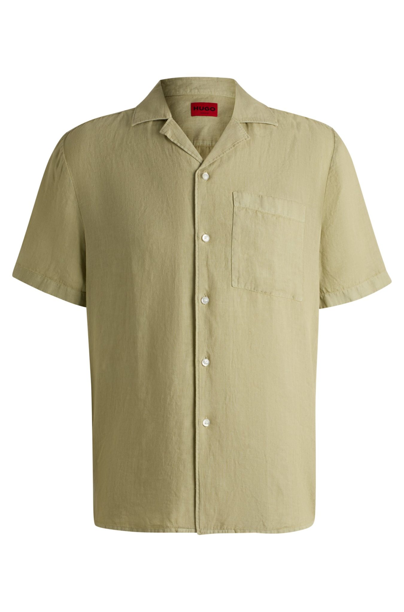 Une chemise à manches courtes HUGO Homme à la coupe Relaxed Fit, confectionnée en lin doux pour un confort optimal en été.