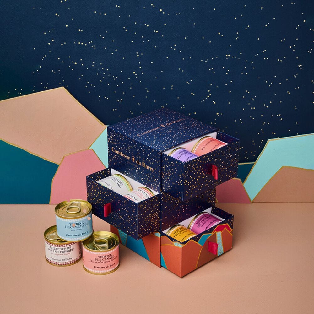 Coffret gourmand de Noël en édition limitée : 12 terrines et rillettes artisanales aux recettes variées et savoureuses. Un cadeau festif et authentique à partager ou à offrir.