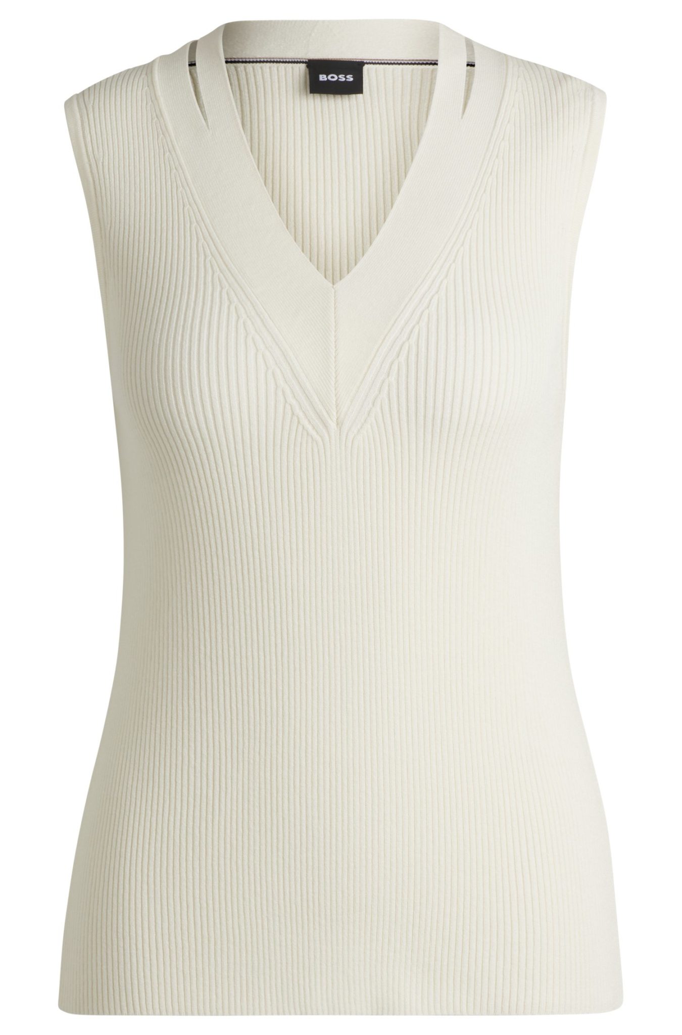 Un top à col V BOSS Femme, confectionné en tissu stretch à la structure côtelée et à découpes. Cette pièce contient des fibres de cellulose certifiées provenant de bois brut naturel issu de forêts gérées de manière responsable. Nous coopérons avec des organisations externes afin de garantir le traitement respectueux des forêts vierges et menacées.