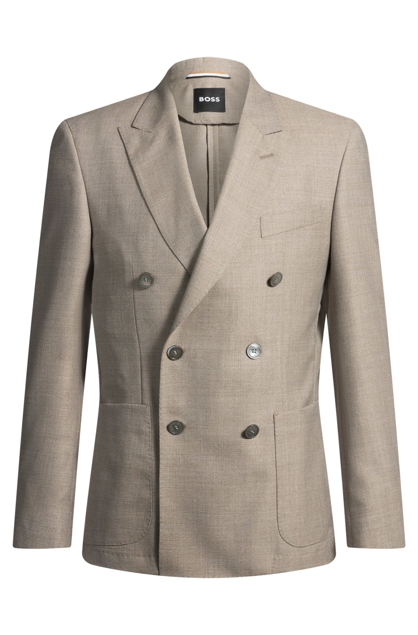 Cette veste croisée BOSS Homme est confectionnée en laine vierge à motif. Elle présente des épaules légèrement structurées et une coupe ajustée. Revers en pointe. Fentes latérales.
