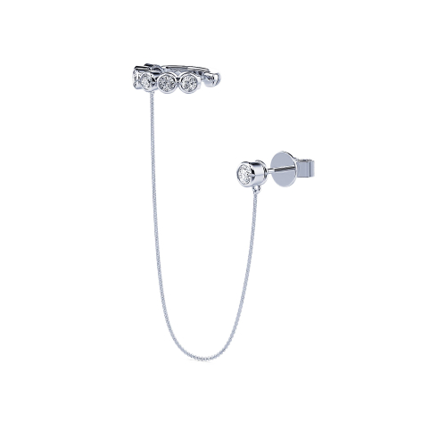 Laissez-vous séduire par l’élégance raffinée de notre bijou d’oreille Esile, une création en or 18 carats d’une finesse exceptionnelle.Serti délicatement de diamants totalisant 0,36 carat, cet ornement se distingue par son design unique : une chaîne délicate relie un quatuor de diamants étincelants à un solitaire lumineux, conçu pour une symphonie visuelle sur votre oreille.Parfait pour agrémenter votre quotidien ou pour compléter votre tenue lors des grandes occasions. Chaque détail, de la brillance des diamants à la fluidité de la chaîne, a été pensé pour captiver et charmer.Créez une harmonie délicate avec l’ajout de nos boucles Lyes, parfaites pour compléter votre look avec sophistication.