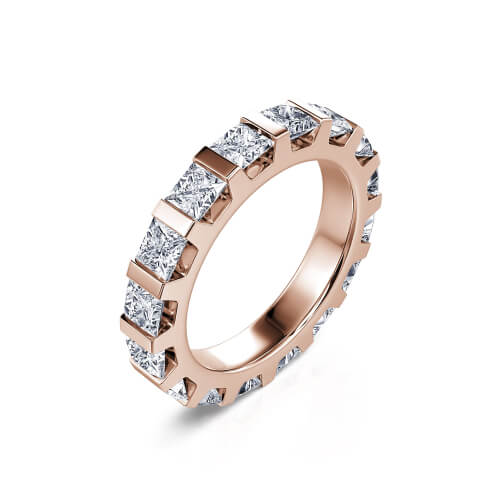 Contemporaine, Safia est une alliance en or rose dont le serti protecteur renferme des diamants carrés sur l’entièreté de sa monture.Épuré, son serti barrette ne touche les pierres que sur deux côtés, laissant ainsi la lumière voyager en profondeur au travers de la pierre. Ses diamants princesse apportent modernité et éclat intense, chacun d’entre eux est parfaitement épousé.Les poids de ses diamants peuvent varier de 0.75 carats à 2.50 carats pour convenir à toutes les envies.Serti inédit et taille de pierre plus classique, l’alliance Shakira est une alternative qui fera chavirer votre c’ur.Les prix des alliances diamants sont majorés de 15% à partir de la taille 60, compte tenu du poids de métal et de diamants plus élevé.